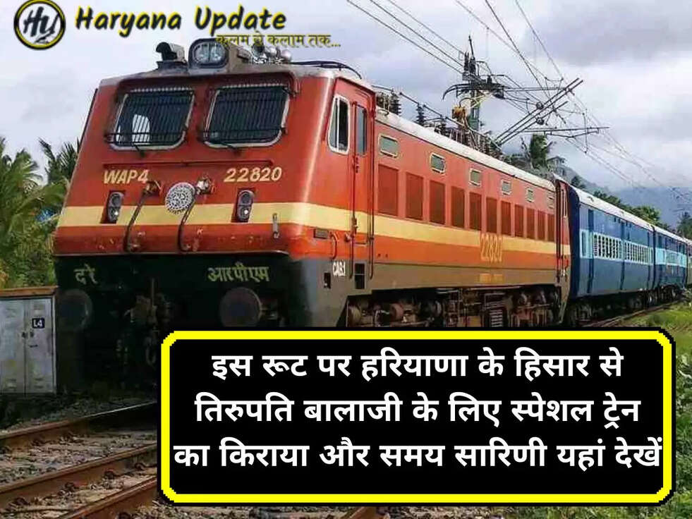 इस रूट पर हरियाणा के हिसार से तिरुपति बालाजी के लिए स्पेशल ट्रेन का किराया और समय सारिणी यहां देखें