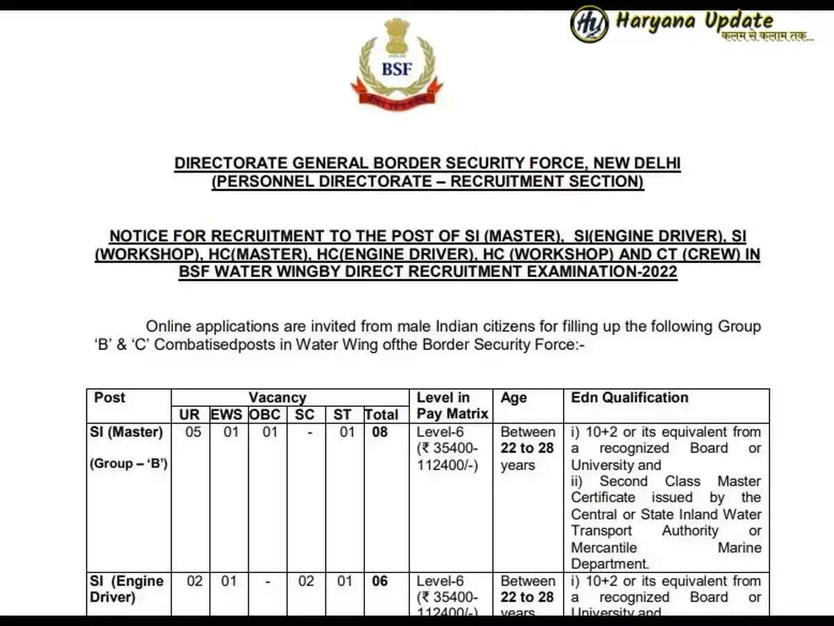 Haryana Update: BSF Head Constable Recruitment 2022: महानिदेशालय सीमा सुरक्षा बल (Directorate General Border Security Force) ने हेड कांस्टेबल (head constable) पदों के लिए आवेदन करने के लिए उम्मीदवारों से आवेदन आमंत्रित किए हैं। योग्य उम्मीदवार इन पदों के लिए बीएसएफ की आधिकारिक साइट rectt.bsf.gov.in के माध्यम से आवेदन कर सकते हैं।