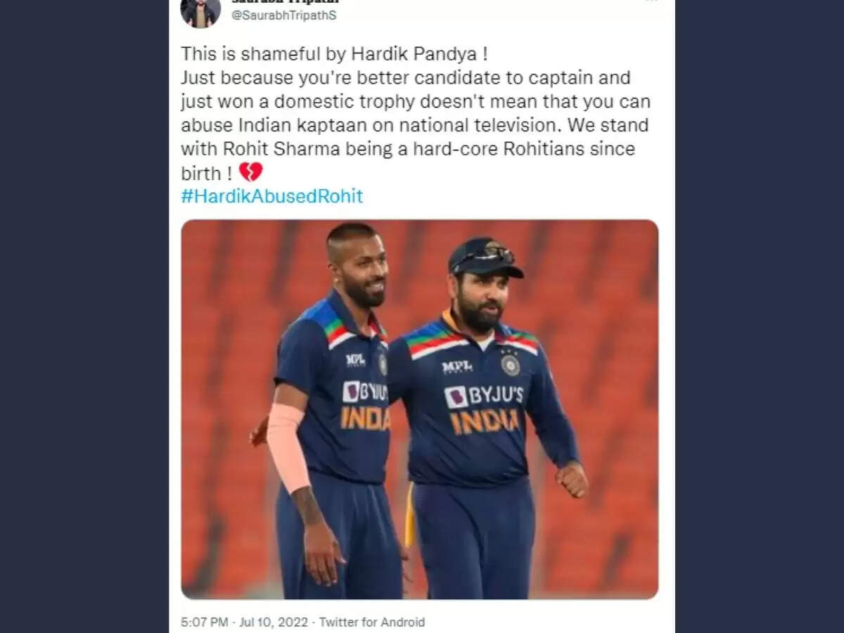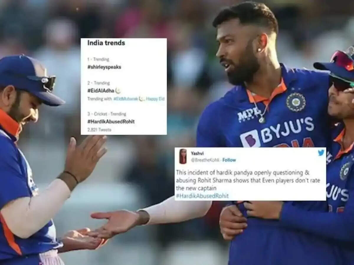 सिर्फ 10 से 15 सेकेंड के इस वीडियो में पूरी कहानी नहीं पता चल रही है. लेकिन यह वीडियो ट्विटर पर लगातार वायरल है और कई तरह के ट्रेंड (#HardikAbusedRohit, #HardikPandya) हार्दिक पंड्या को लेकर चलाए जा रहे हैं. जिसमें ट्विटर यूज़र्स ने लिखा है कि हार्दिक पंड्या ने रोहित शर्मा को गाली दी है, साथ ही हार्दिक पंड्या पर घमंडी होने का आरोप भी लगाया गया है.