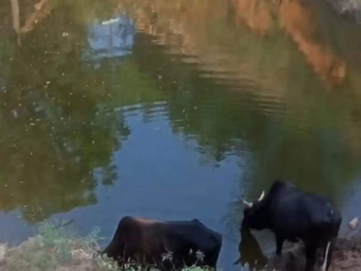 पानी पीने के लिए पहाड़ी पर बने तालाब की ओर बढ़ते पशु।