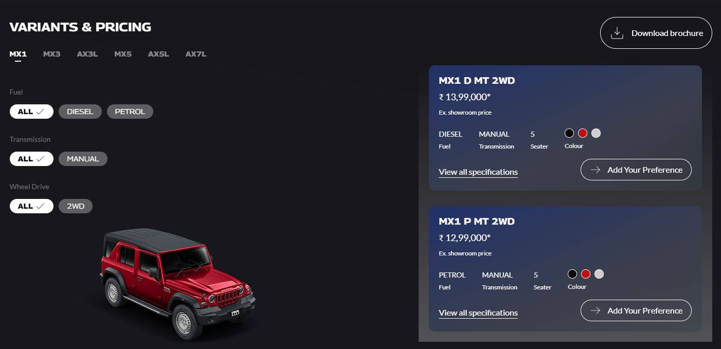 कुछ ग्राहकों को पेट्रोल इंजन विकल्प के साथ फोर-व्हील ड्राइव (4X4) सिस्टम का इंतजार था. लेकिन थार रॉक्स के केवल डीजल इंजन ऑप्शन में ही फोर-व्हील ड्राइव दिया जा रहा है. हालांकि कंपनी ने अभी इस एसयूवी के सभी वेरिएंट्स की कीमतों का ऐलान नहीं किया है. इसके अलावा आधिकारिक वेबसाइट पर भी पेट्रोल (4X4) को लिस्ट नहीं किया गया है. हालांकि अभी पेट्रोल इंजन के साथ आने वाले कई वेरिएंट्स (AX3 L, MX5, AX5 L, AX7 L) की कीमतों का सार्वजनिक किया जाना बाकी है.