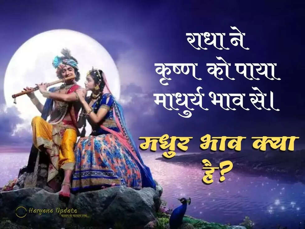 राधा (Radha) ने कृष्ण (Krishna) को पाया माधुर्य भाव से। मधुर भाव क्या है? अपनी समस्त सत्ता- शारीरिक, मानसिक, सामाजिक, आध्यात्मिक को एक बिंदु में प्रतिष्ठित करने तथा अपना समस्त आनंद इन कृष्ण से ही पाऊँ-इसी सोच का नाम है माधुर्य भाव। यही है राधा भाव। 99 प्रतिशत भक्त इसी राधा भाव को लेकर रहते हैं। इससे पूर्व इतिहास में परमपुरुष को मधुर भाव में किसी ने कहीं नहीं पाया। प्रथम बार ब्रज के कृष्ण को मधुर भाव में पाया राधा ने। ब्रज के कृष्ण भी उसी प्रकार बांसुरी बजाकर उस माधुर्य की ओर अपने को बढ़ा देते हैं। यही है माधुर्य भाव। रस में सराबोर माधुर्य से मनुष्य पहली बार परमपुरुष को अनुभव करता है, पाता है ब्रज के कृष्ण के रूप में।