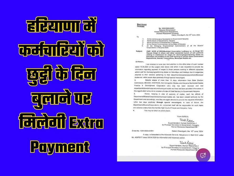 Haryana Govt Employees: हरियाणा सरकार का पत्र जारी इसमें कर्मचारियों को अगर छुट्टी के दिन बुलाया जाएगा तो उसको अलग से पेमेंट दी जाएगी।