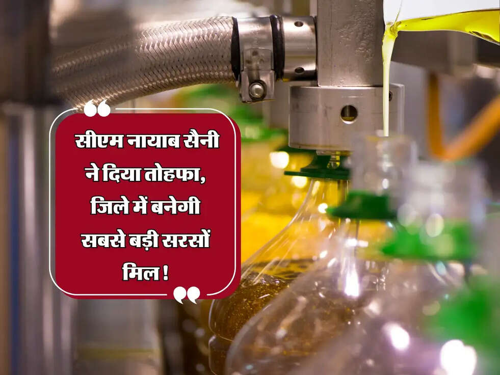Haryana Farmers: हरियाणा के नारनौल में एशिया की सबसे बड़ी सरसों तेल मिल लगाने का ऐलान किया गया है। इस मिल से राज्य के किसानों को अपनी फसल का उचित मूल्य मिलेगा और रोजगार के नए अवसर भी पैदा होंगे। मुख्यमंत्री नायब सिंह सैनी ने इसे किसानों के लिए एक बड़ा तोहफा बताया है। इस कदमसे हरियाणा के कृषि क्षेत्र में आर्थिक विकास की गति तेज होगी। नीचे पढ़ें पूरी डिटेल।