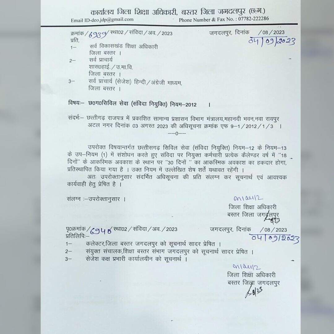 Employees, Employees Holiday: छत्तीसगढ़ में संविदा कर्मचारियों को 18 दिन की जगह 30 दिन का आकस्मिक अवकाश प्रदान किया जाएगा। राज्य सरकार ने आदेश जारी करने के बाद अब जिलों से भी आदेश जारी होने लगे हैं। बस्तर के डीईओ ने सभी बीईओ, प्राचार्य और उपप्राचार्य को पत्र जारी किया गया है।